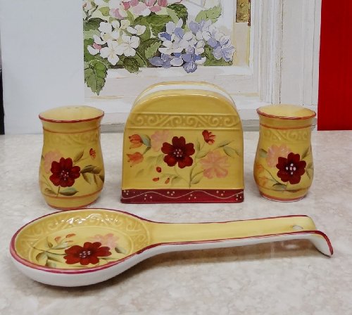 • Stovetop Set 4-piece includes: Spoon Rest 10"L, Napkin Holder 5"L x 4 1/2"H, and Salt & Pepper Shakers 3 1/2"H