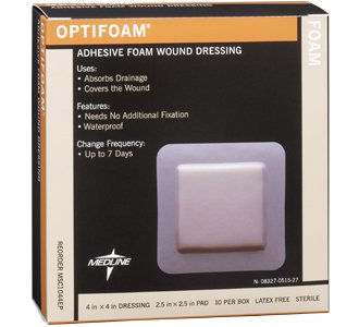Studio : Medline Publisher : Medline Binding : Misc. Product Description An all-in-one dressing for fluid handling. Moisture vapor transmission rate (MVTR) adjusts to fluid level. Highly absorbent. Helps create ideal healing environment. Waterproof outer layer protects wound and keeps bacteria out (except Optifoam Basic).Indications: pressure ulcers, partial and full-thickness wounds, leg ulcers, donor sites, lacerations and abrasions, skin tears, and first- and second-degree burns. Contraindications: third-degree burns and lesions with active vasculitis. May be left in place for up to 7 days; Dressing change frequency will depend on amount of drainage. 0