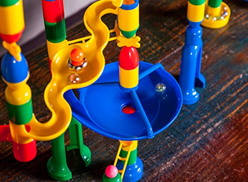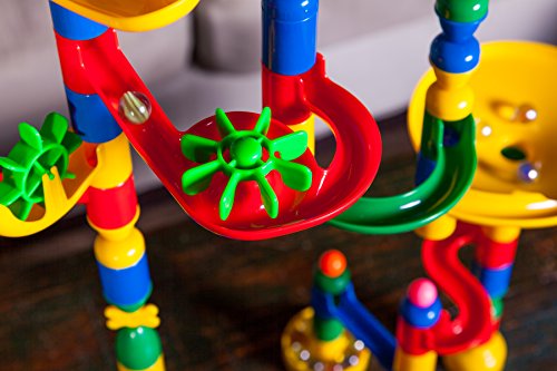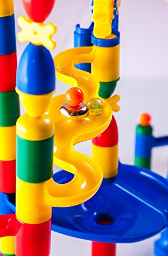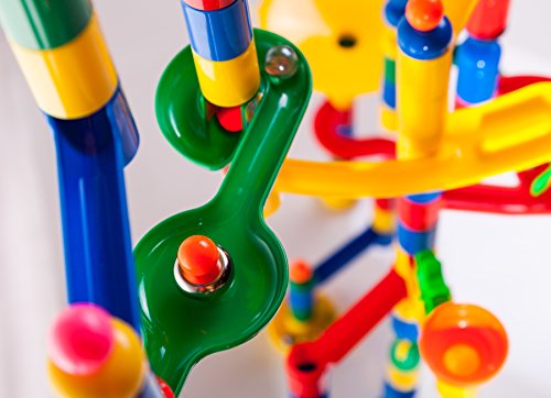 Drop and roll! This colorful marble run set includes 200 track components and 20 marbles (220 total pieces). Use the enclosed booklet for 35 piece, 44 piece, 99 piece, 151 piece and 219 piece designs - final designs are clearly illustrated along with images of each component needed for easy construction. Track pieces include rails, tubes, spinners, funnels, carousels, bells, chutes, caps, bases and a stair stepper to mix and match and create unique mazes of your own. Drop one or several marbles at once depending on your creation but don't worry, the base pieces capture the marbles so that they don't get lost! Measures 18" L x 4" W x 15" H when assembled. Age 4+