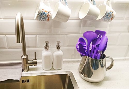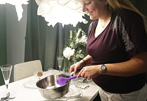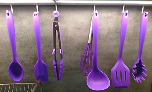[Description] ERGONOMIC AND DURABLE PREMIUM SET of silicone utensils. Our silicone utensils feature ergonomic handles with comfortable grip for easy handling_ and are created with contemporary solid hygienic design with no gaps to keep them germ free for healthy cooking. Our superior tools feature a strong steel core covered in silicone for the perfect combination of durability and flexibility_ preventing scratching of your pans. There is a handy hole at the end for easy hanging and convenient access. 100% FDA Food-Grade_ with no BPA_ heat resistant up to 440°F and dishwasher safe silicone kitchen utensil set. Also hygienic_ odor-free_ will not soak in any food residue. Completely safe for your family and your food! We used the result of years of research to come up with this special material for you! SOLID METAL CORE kitchen equipment for hardness_ Silicone Rubber for flexibility on the ends. Firm grip_ and gentle on your cookware_ leaving no scratches! 100% Satisfaction GUARANTEED. If you are not satisfied with our silicone utensil set_ you can return them for a full refund - no questions asked. PERFECT GIFT We spent time choosing this vibrant color for this purple utensils! The cooking set comes in full color packaging_ truly perfect gift for weddings_ housewarming_ graduation_ birthdays and Mother``s Day. The unique style and ultra-high quality cooking utensil set will impress anyone who receives them.