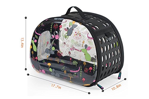 -. Feature : • STYLISH TRANSPARENT - The transparent hard case pet carrier has the best features of both hard and soft carriers for small cats and dogs, kittens and puppies. It made with transparent hard plastic material, while P.R.Inted a variety of fashionable cute animal patterns, not only appearance is beautiful, but easy to clean, more convenient for your lovely pets to observe the outside world. It Disassembles with SMOOTH ZIPPERS for easy storage and transportation. / • VENTILATED BREATHABLE MESH - Breathable EVA stomata, bags ups and downs use ventilation EVA material, portable and light, and also with the design of a ventilated mesh, so even the hot weather is also breathable. Breathable mesh out of the door, front design zipper open the door, easy access, breathable mesh, so that pets breathe more smoothly, more open vision. / • INCLUDED COMFORT PAD-There are two washable, removable, comfortable pads in the carrier that is sure to keep your pet feeling relaxed and comfy. The removable pad has a special diaper friendly design; Diapers can be easily fixed or removed. / • VERSATILE CARRY OPTIONS AND COLLAPSIBLE FOR STORAGE - Use the adjustable shoulder strap, integrated carrying handles, or the side tote strap to attach the carrier to your rolling lage handle for hands-free use. This light weight pet carrier collapses to 3 inches narrow as the two outer shells collide and zip together. This pet carrier comes with an over-the-shoulder straps and two removable, washable, comfortable pads. / • 100% MONEY BACK GUARANTEE ensures this will quickly become your favorite no-risk purchase. Return for refund within 45 days. 12 MONTH WORRY FREE WARRANTY. HURRY AND BUY NOW while we have this very popular cat carriers in stock. This makes a wonderful gift for your pet's birthday or Christmas. Great for friends, family, and co-workers who have a cat or dog they love.