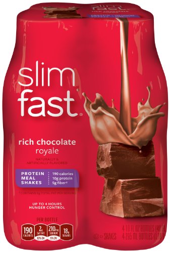 -. Binding : Health and Beauty -. Brand : Slim-Fast -. EAN : 0008346122035 -. Feature : Pack of 4, 10-ounce convenient, re-sealable bottles of Slimfast 3 2 1 Plan Shakes / 180 to 190 calories for each ready-to-drink shake / Up to 4 hours of hunger control with 10 grams of protein and 5 grams of fiber per bottle / One-Third of your recommended intake for most essential vitamins and minerals / For use as part of the Slim-Fast 3-2-1 Plan TM -. IsAdultProduct : 0 -. Label : Slim-Fast -. Manufacturer : Slim-Fast -. Model : 10008346122032 -. MPN : 10008346122032 -. NumberOfItems : 1 -. PackageQuantity : 1 -. PartNumber : 10008346122032 -. ProductGroup : Health and Beauty -. ProductTypeName : HEALTH_PERSONAL_CARE -. PublicationDate : 2011-09-02 -. Publisher : Slim-Fast -. Size : Pack of 4 -. Studio : Slim-Fast -. Title : SlimFast Rich Chocolate Royale Ready To Drink Shakes, 4 Count -. UPC : 008346122035