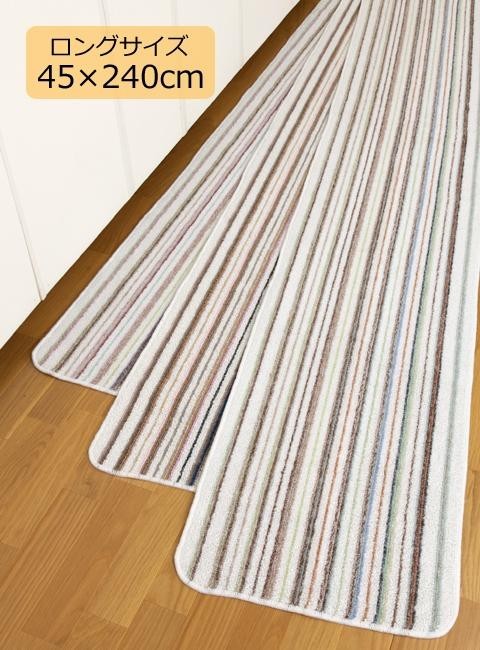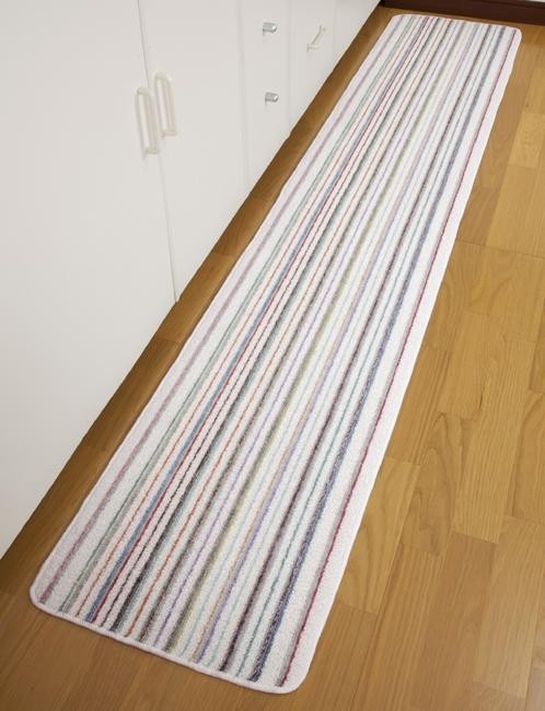 | 幅240cmのロングサイズ☆カラフルでおしゃれなストライプ柄のキッチンマットです。裏面に滑りにくい加工を施しているので、横ズレしにくいです!! |