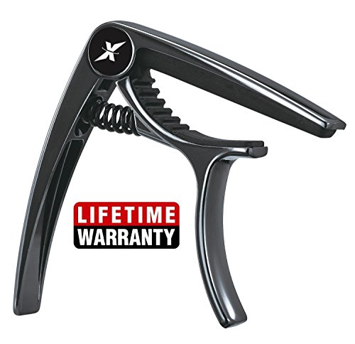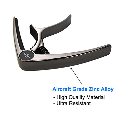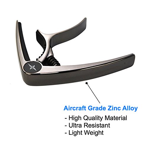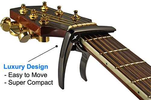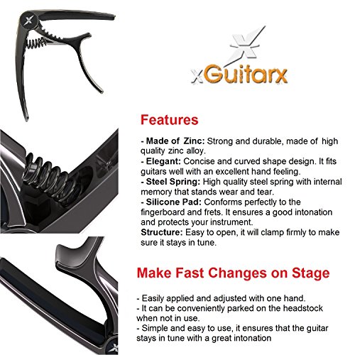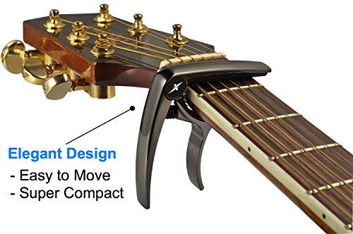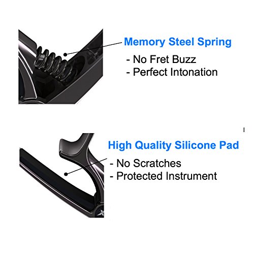 Built Strong to Last With an Outstanding Modern Design - The x1 Capo is designed accurately for great performance - It uses a mechanical spring with internal memory to provide strength and fatigue resistance - Made for acoustic and electric guitars, ukulele, banjo and mandolin- Quickly change position between frets on stage with one hand Make Fast Changes on Stage - Easily applied and adjusted with one hand - It can be conveniently parked on the headstock when not in use- Simple and easy to use, the guitar stays in tune with a great intonation Features - Made of Alloy: Strong and durable, made of high quality alloy - Elegant: Concise and curved shape design. It fits guitars well with an excellent hand feeling - Steel Spring: High quality steel spring with internal memory that stands wear and tear - Silicone Pad: Conforms perfectly to the fingerboard and frets. It ensures a good intonation and protects your instrument