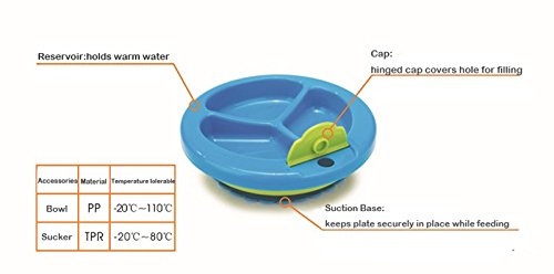 -. Feature : New BPA PVC and phthalate free / Keep food warm when base is filled with warm water / Divided compartments and non-slip suction on bottom / Dishwasher safe / Package include:1pcs baby insulation bowl with gift box