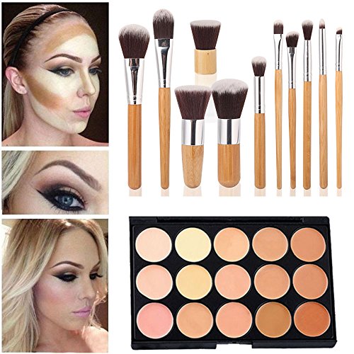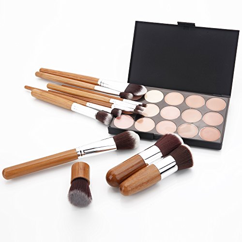 Feature : Cream concealers that offer terrific coverage on the dark circles, facial wrinkles and other facial defects and give you a new look. / Natural bamboo handle, high quality synthetic taklon bristles / Essential makeup brushes - Perfect for liquids, powders or creams. / Each brush is crafted meticulously starting with the wooden handle and aluminum alloy ferrule. / Package Includes: 1 x 15 Colors Concealer Palette; 11 Pcs Makeup Brushes
