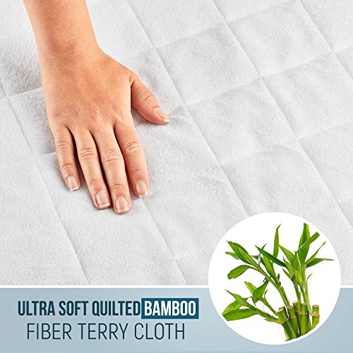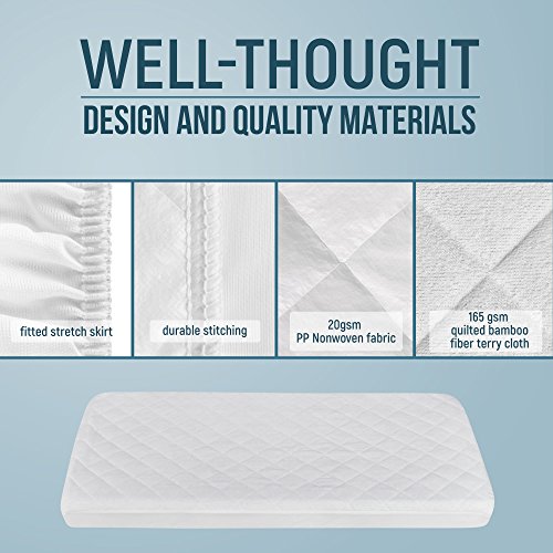 - BEST DESIGN. The well-thought-out design and quality materials makes our bamboo mattress pad 100% effective. Face - 165gsm quilted white bamboo fiber terry cloth. Back - 20gsm PP Nonwoven fabric. The top 3 layers are quilted, and then laminated with TPU. A safe product with no toxic or harmful substances.
