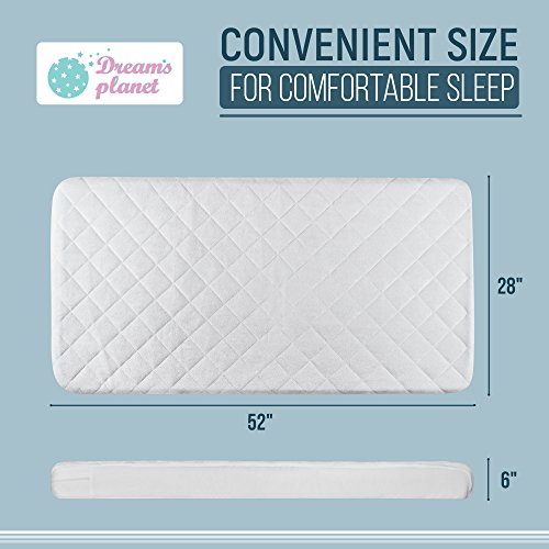 - CHOOSE THE SIZE. We offer 2 sizes of the Dreams Planet mattress pad for baby: 39x27x6 inches and 52x28x6 inches. Skirt: 70gsm 100% Poly Knit Fabric. The fitted stretch skirt stays secure and does not slip on the mattress – this is essential for a baby’s crib.