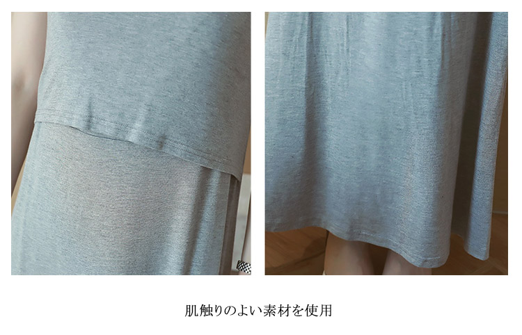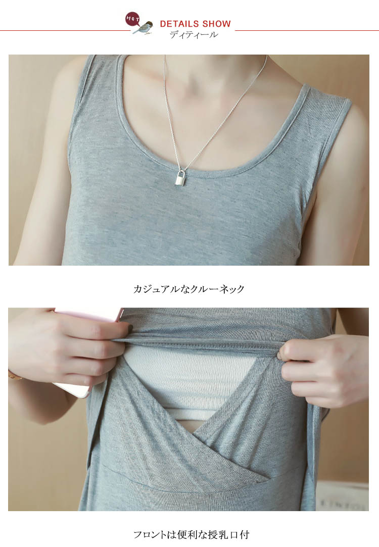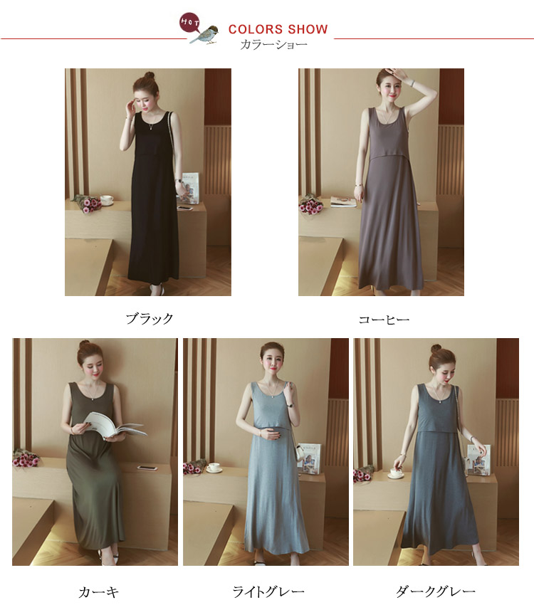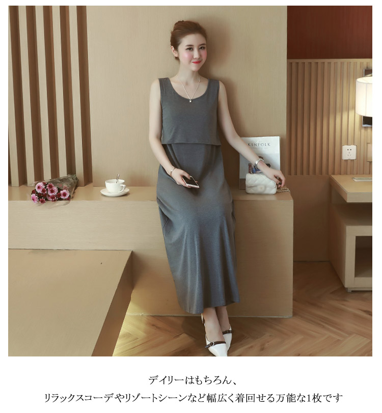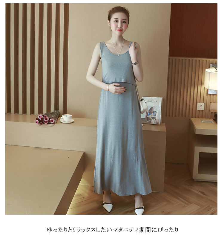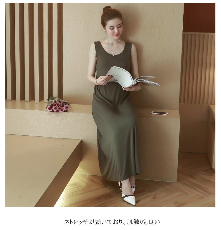 | 授乳口付きのノースリーブマタニティロングワンピースストレッチが効いており、肌触りも良いゆったりとリラックスしたいマタニティ期間にぴったりデイリーはもちろん、リラックスコーデやリゾートシーンなど幅広く着回せる万能な1枚です | |