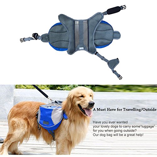 -. Feature : Size info:S size suitable for 16-39 lb,M size for 39-61 lb,L size for 61-88 lb pets.(All the detailed size is shown in our picture.) / Dog hiking pack is made of high quality 600D Oxford cloth,breathable harness bring your loved dog comfortable feelings.Your dog won't be bothered by the backpack at all. / Dog backpack has two convenient pockets,adjustable straps and a soft-mesh lined,the handle on this backpack helps lift dog up over obstacles when you are outward hounding or training,practical and stylish. / This dog saddle bag can hold water bottles,poop bags,toys,collapsible dog bowls,first aid,weights,etc.Ergonomic padded spine and breathable mesh harness support contours to the dog's back. / Great gifts for dog lovers,perfect for service dogs daily walking,shopping,hiking,jogging,camping or training.