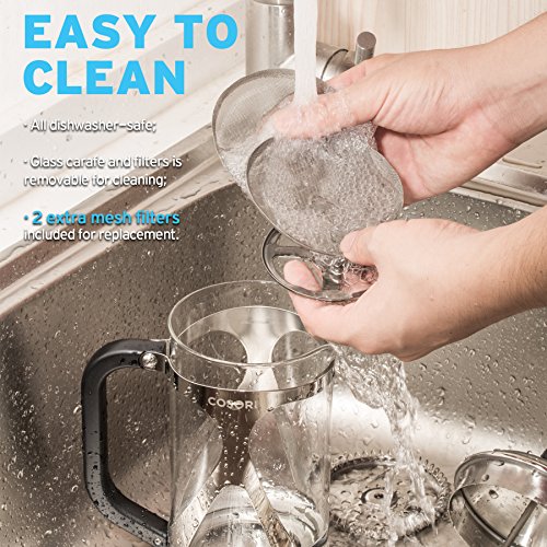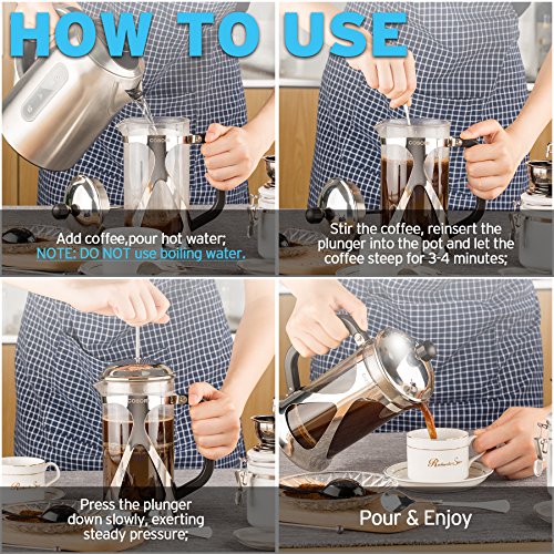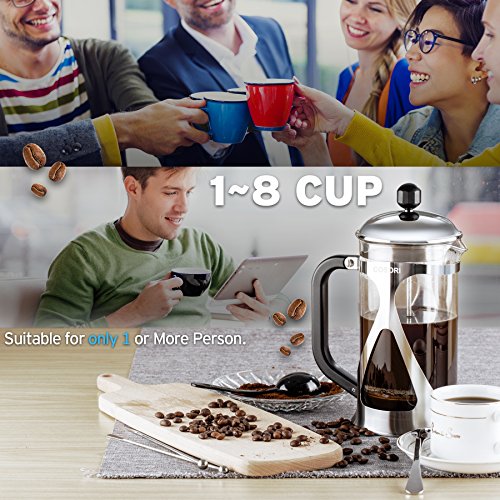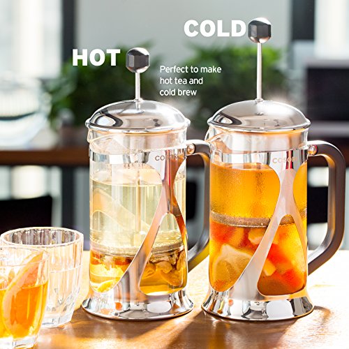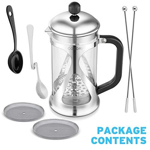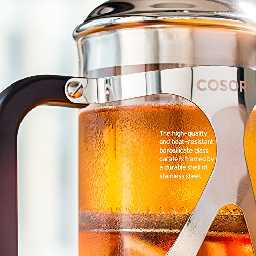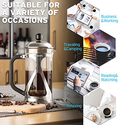 Coffee Lovers RejoiceWhether you enjoy your coffee early in the morning or with company, have a cup of your favorite coffee or tea freshly and perfectly brewed with Cosori 8-Cup French Press in minutes. Designed with high quality materials, the Cosori French Press is easy to use and clean and can last a lifetime to satisfy your coffee cravings. The luxurious design also fits in any kitchen and is the perfect gift for that special coffee lover in your life. The Cosori 8-Cup French Press will remove all the coarse-grounds from your coffee providing a delicious smooth cup of coffee every time! Save a trip to the coffee shop and save money when you can use Cosori French Press.