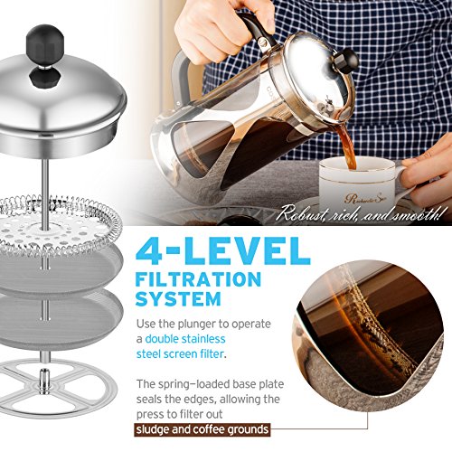 4-LEVEL FILTRATION SYSTEM: Use the plunger to operate a double stainless steel screen filter. The spring-loaded base plate seals the edges, allowing the press to filter out sludge and coffee grounds. Enjoy coffee that is robust, rich, and smooth, with minimal residue settling at the bottom of your mug