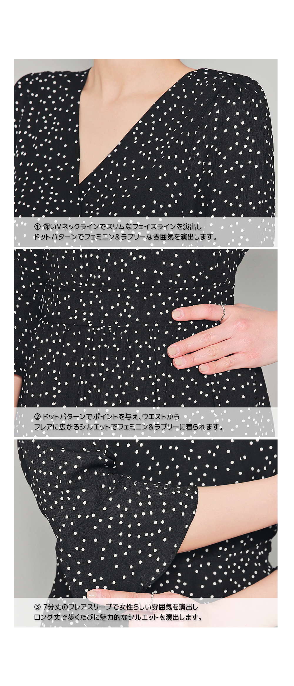 着ると自然に女の子らしくなっちゃうワンピース、程よく開いたVネックがフェイスラインをキレイに見せ、めずらしい袖デザインがポイントになります^^* ドット柄でかわいらしさを+し、足首までの丈で歩く度にひらひら♪ デートやお呼ばれにはもちろん、しょっちゅう着たくなるワンピースです☆ *ご購入前に、詳細写真とサイズを必ずご確認ください。