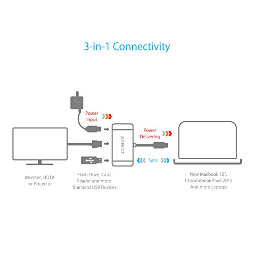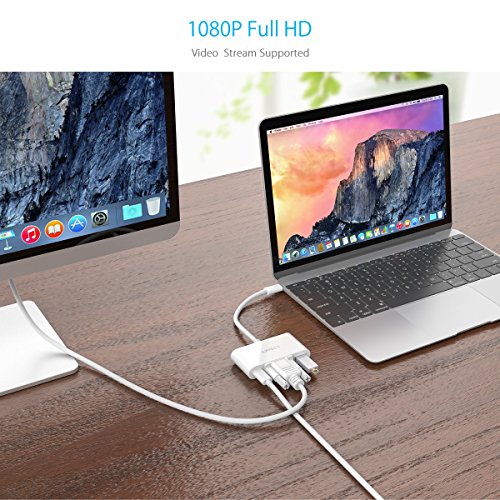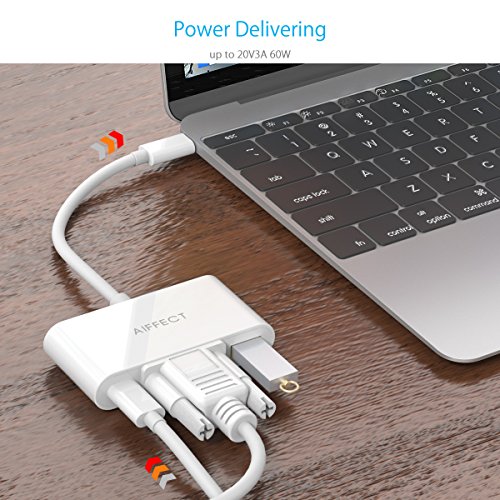 AIFFECT Type C to VGA Adapter, USB 3.0 Hub with PD Charging port for Apple Macbook, Chromebook Pixel and other Type C Devices - White