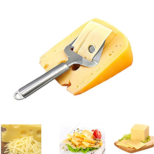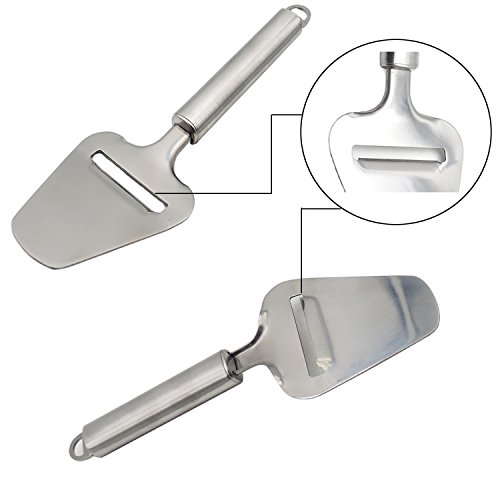 Cheese Slicer: Food grade stainless steel shovel plane and peeler for cake, pizza, soft & hard cheese, chocolate. edge dig-hole design and hook are all for your convenience storage.
