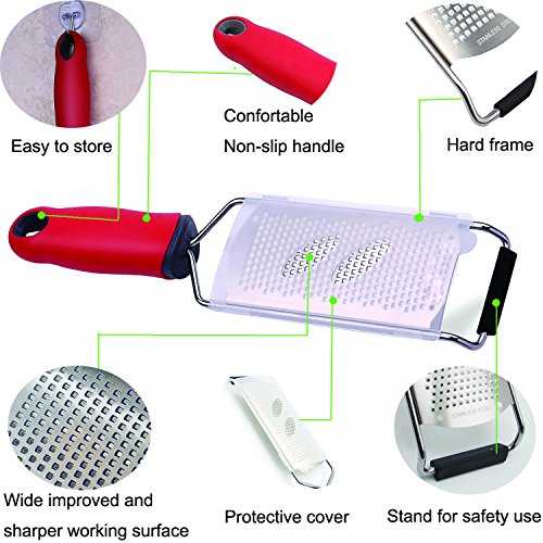 Cheese Grater & Lemon Zester: Handheld stainless steel grater with comfortable handle and non-slip base and Protective Cover