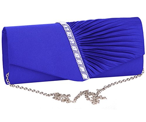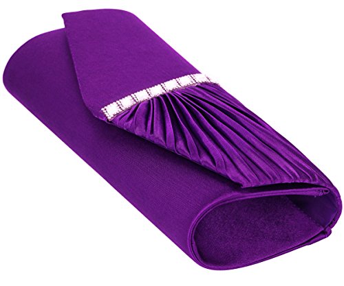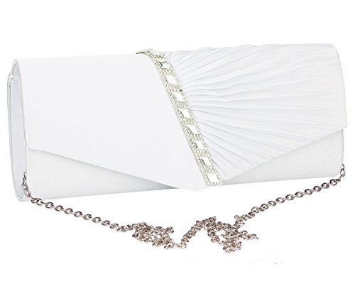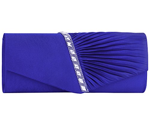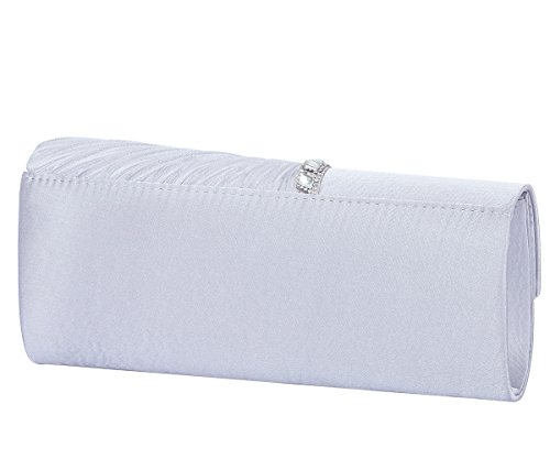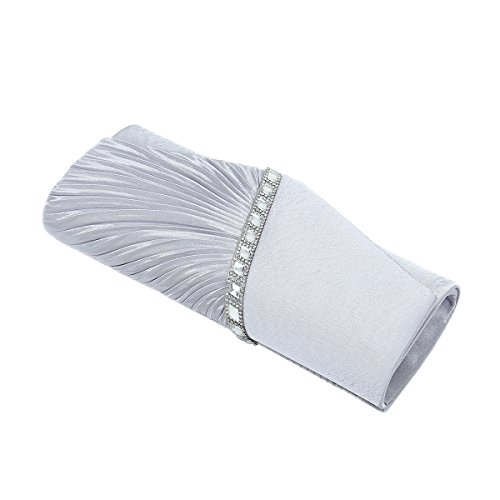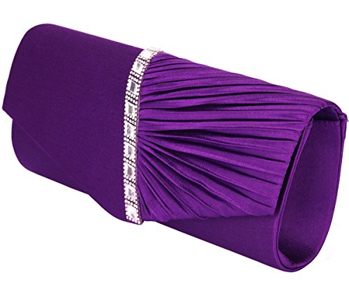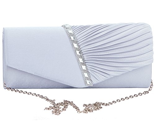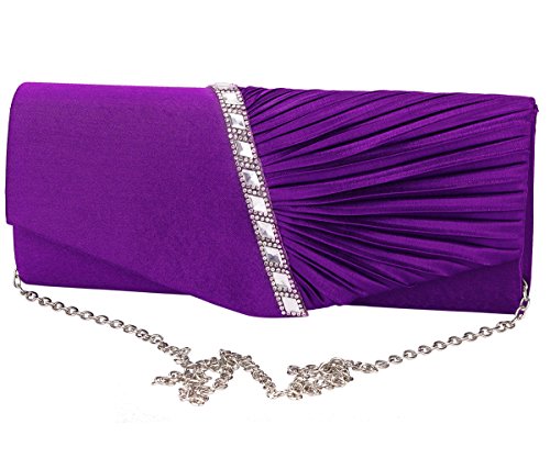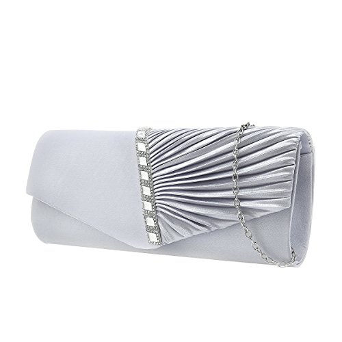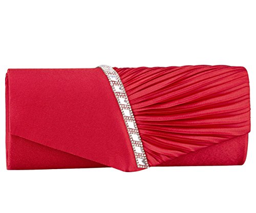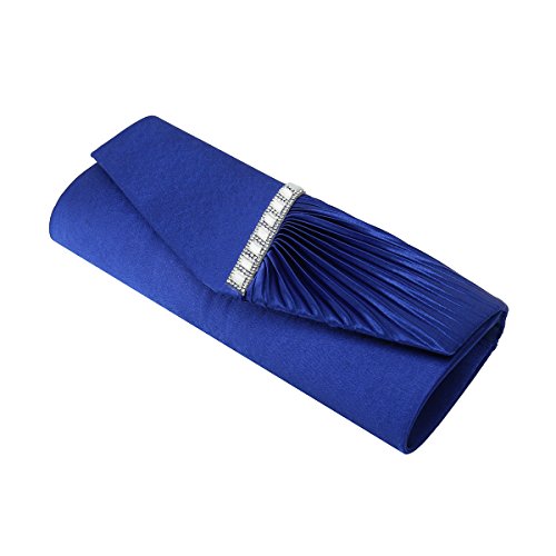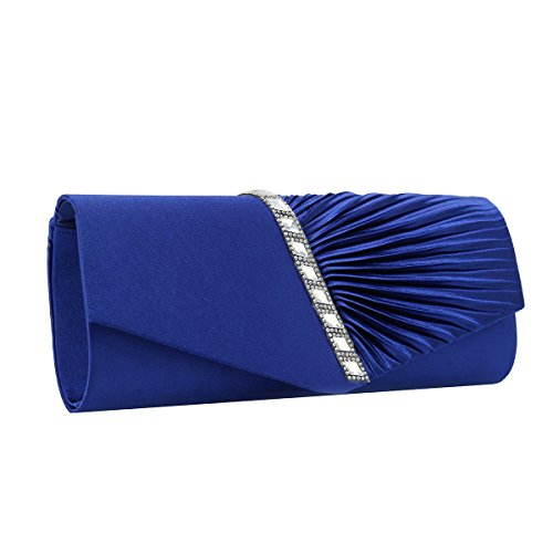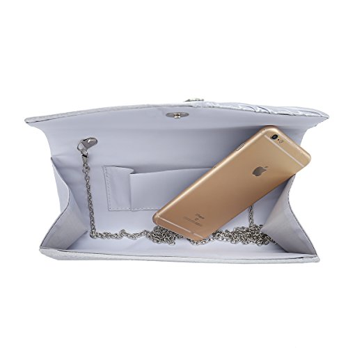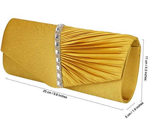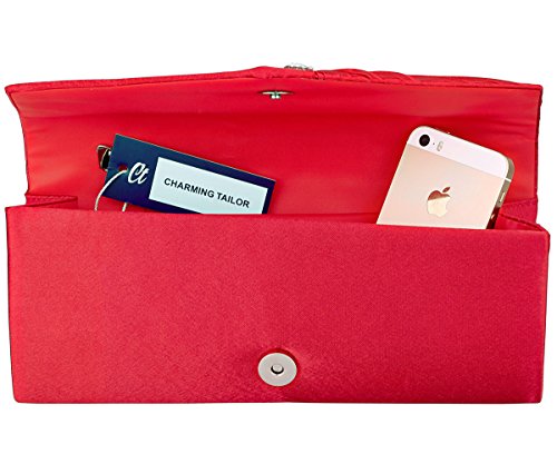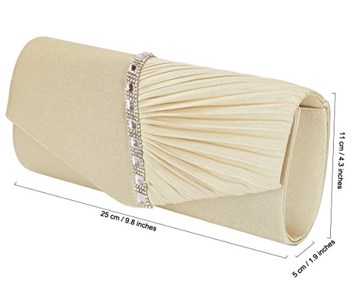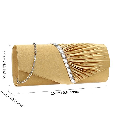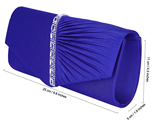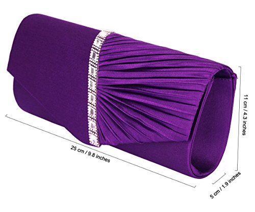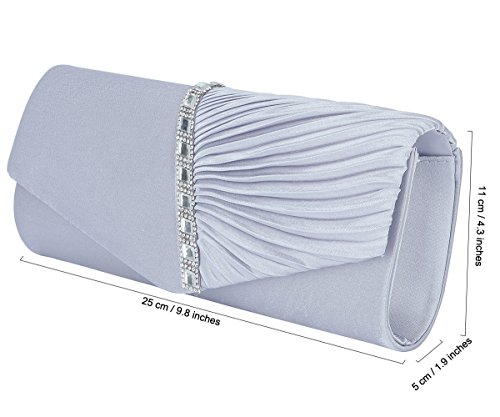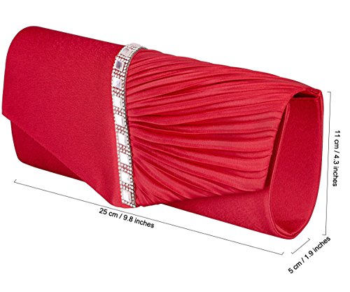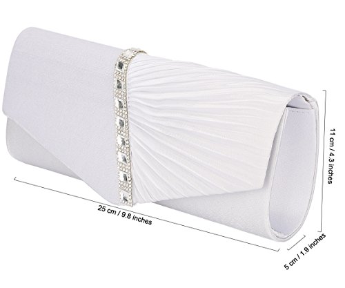 Detailed Features: Dimensions: W9.8 x H4.3 x D1.9 inches or W25 x H11 x D5 cm, spacious room and it effortlessly holds all the essentials, large smart phone, iPhone 7, makeup, glasses, wallet, tissues, lipstick, blotters, battery charger. Precious and feminine touch, made of high quality satin, with solid case frame. Satin lining Flap Opening with ingenious magnetic snap, will keep your belongs secure and allow you to open the clutch easily Elegant Ornament, a band of shinning rhinestones details and pleated fabric design, which favor this bag elegant and charming. Great for wedding, party, prom, ball or other day or evening events. COMES WITH O SHAPE METAL CHAIN (with 21.5” drop), WON'T GET CAUGHT YOUR LONG HAIR OR GRACEFUL DRESS.