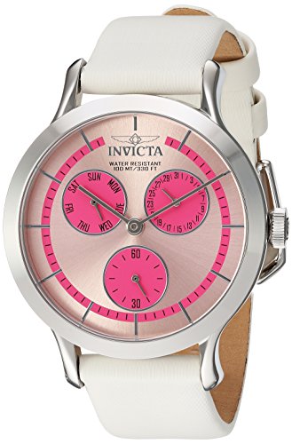 Invicta 22494 Angel women's watch features a 38mm wide and 11mm thick solid stainless steel case with a fixed bezel and textured push-pull crown. Invicta 22494 is powered by Japanese SII VD76 quartz movement. This beautiful watch also features a textured shiny sunray rose gold tone and pink dial with silver tone luminous hands and index hour markers along with the day and date display functions, scratch resistant mineral crystal and water resistant to 100 meters. Invicta 22494 is equipped with an 18mm wide genuine white leather strap with a buckle clasp. Invicta 22494 women's Angel rose gold & pink dial white leather strap watch is brand new and comes in an original Invicta gift box and is backed by a 5 year limited warranty.Feature