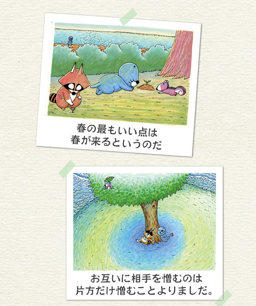 なくても困らないと必要ない/夢が変な理由/趣味は大人向けの遊び/歩くのが好き/友だちていいよね/ジャボンの発見/面白いことも面白くないこともすべてこの世のもの/好きなのは額の上にくっついているよ