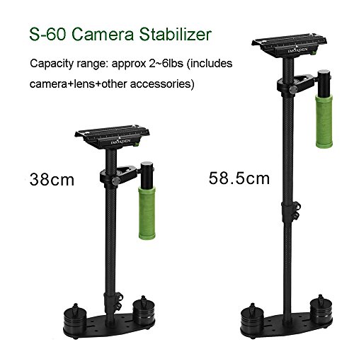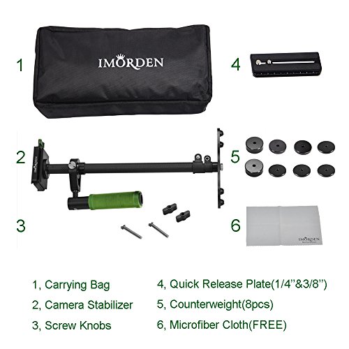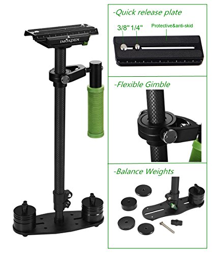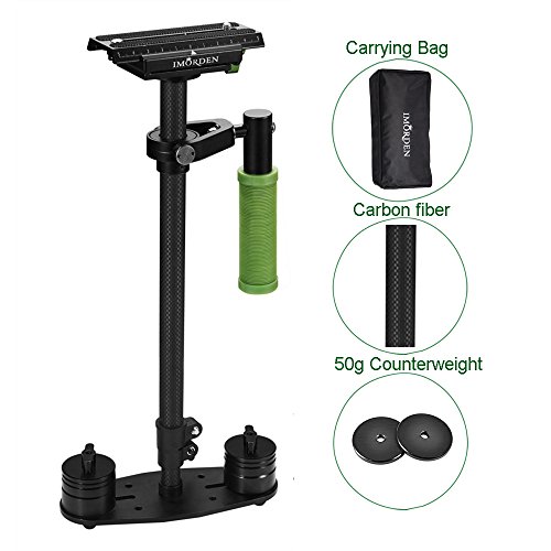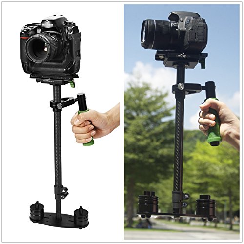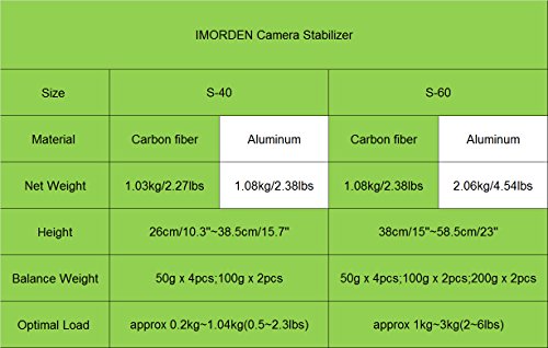 Carbon fiber shaft. Weight: 1.08kg. (1kg less than Aluminum stabilizer) Balance weight: 200gx2pcs, 100gx2pcs, 50gx4pcs for light cameras like Gopro or your smartphone.