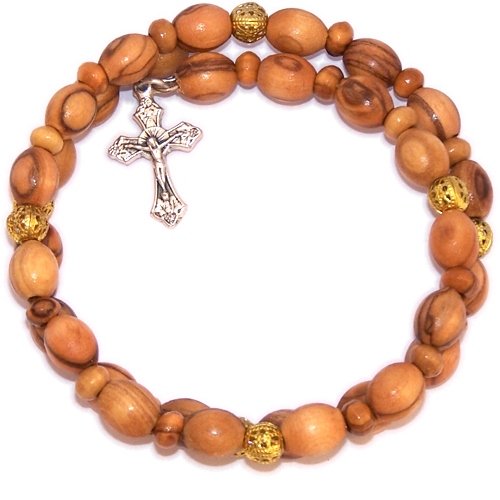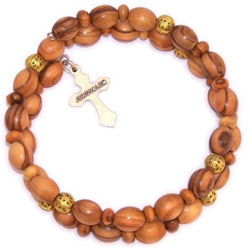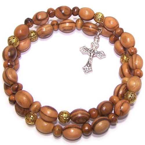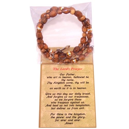 Expandable wired Olive wood religious bracelet with Silver tone Crucifix *** packed as a gift with special Certificate of Authenticity and origin and a FREE Lord's Prayer gift card