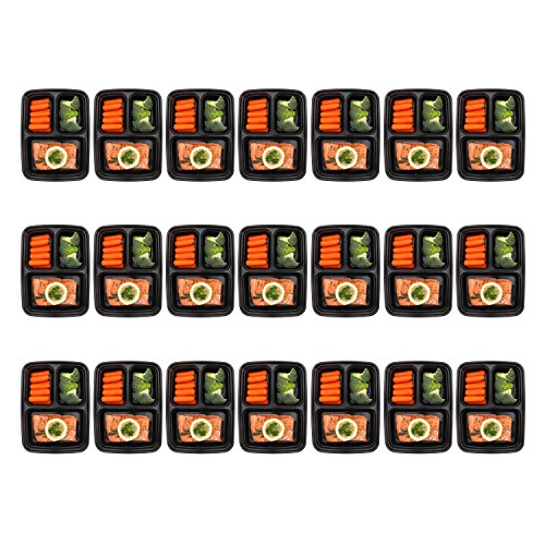 - A COMPLETE MEAL IN ONE BOX + PORTION CONTROL: This 21-Pack set of Bento Boxes features 3 different compartments so you can freeze or take with you a complete meal just in one container. Use them for your main course, salad and dessert and enjoy your meal everywhere, hassle free. Each meal prep container can store a total of 24oz (12-6-6 oz) which are the perfectly controlled portions to stay full, yet fit and healthy!