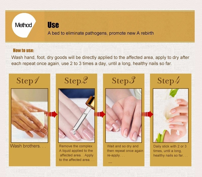 3.Advantages:. Easy to use, easy recovery Simplify, simplify many complicated treatment process, avoiding complicated manicure, A pull avoid pain. Strong penetration, strong inhibition of bacteria, 7 days inhibit bacterial growth, reproduction Capacity, so that the bacteria are no longer contagious, 30 days thorough sterilization, began to grow healthy, beautiful, smooth nails Useu0026nbsp;