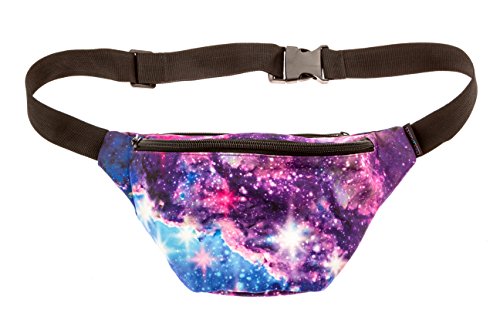 -. Feature : Super cool galaxy printed fanny pack / 2 zippered compartments / 1 hidden pocket on the inside / Great for raves, festivals, hiking, and outdoor activities / Fits size 28-40 inch waist