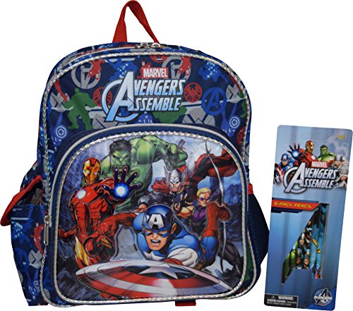 -. Brand : Avengers -. Color : Blue -. Department : boys -. EAN : 0700118156575 -. Feature : Made of an easy to clean and very durable polyester cordura fabric with stunning embossed 3D logos / Features one large zippered compartment books. Practical flap over and net side pockets and one front cargo zippered pockets / Special padded adjustable shoulder straps and padded back for additional comfort / This item includes a 6 pack Avengers wood pencils / Dimensions: 12"H x 10.25"W x 4.25"D -. PackageQuantity : 2 -. ProductGroup : Apparel -. ProductTypeName : LAGE -. Size : Medium -. Title : Marvel Avengers Deluxe 3D Embossed 12" School Backpack W/ Bonus 6Pk Pencils -. UPC : 700118156575