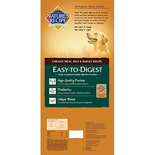 Nature’s Recipe Easy to Digest Chicken Meal, Rice & Barley Recipe is premium dog food crafted with real chicken, a source of high-quality protein that is gentle on your dog's stomach. This exclusive formula also avoids ingredients commonly associated with food sensitivities, such as corn, wheat, or beef, and it is fortified with prebiotics to help support healthy digestive function. This healthy dog food also contains a proprietary blend of natural fibers to help ease digestive issues, making for a delicious meal that will help your dog thrive!Feature