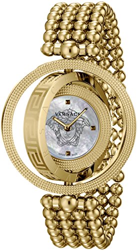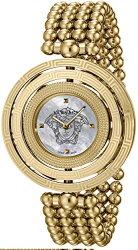 When Versace introduced their magnificent this Eon timepiece it quickly became an instant classic. The iconic design is resplendent with Versace imagery, including the famous Versace Medusa head in middle of the case. Featuring two reversible bezels engraved with Versace and Greca emblem including the Clouse de Paris finish this watch is a triumph. This timepiece is powered by an ISA K62/132 Swiss Quartz movement to enable its preciseness wherever you go. The fashionable mother of pearl dial with four dot indices and a yellow gold IP stainless steel case, which includes a gorgeous diamond bezel ring, is water resistant to 99 feet. If you'd like to maximize the enjoyment you get from wearing a fine timepiece, you need to experience the delicate baroque beauty of an Eon on your wrist.