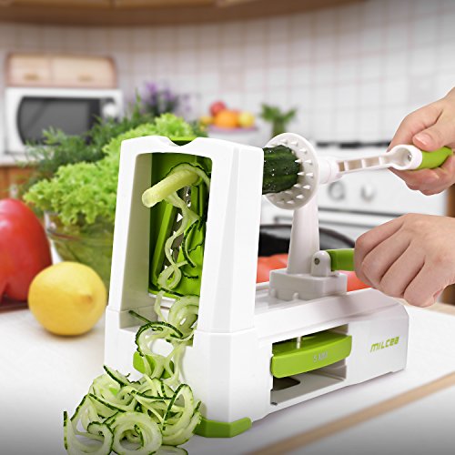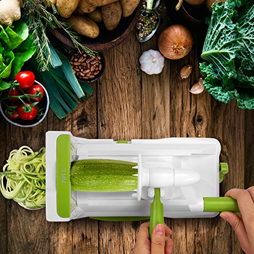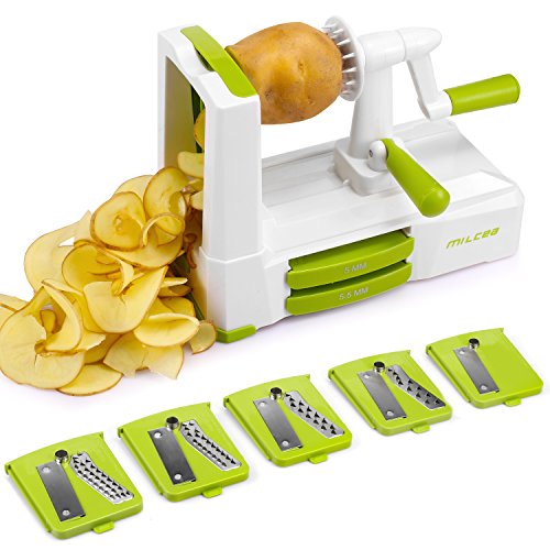 HIGHLY VERSATILE: You will get 5 clearly labeled 420 stainless steel blades to make a wide variety of cuts (angel hair, spaghetti, fettucine, curly fries, and ribbons) Perfect for Making Quick Low Carb, Paleo, Gluten-Free Meals,Veggie Pasta Spaghetti, Healthy Veggie Noodles from Firm Fruits/Veggies Like Apple, Onion, Carrot, Zucchini, Cucumber, Cabbage, Beet, Turnip, Rutabaga, Radish, Potato, Sweet Potato, Squash & More. Open up a whole new world of healthy eating!