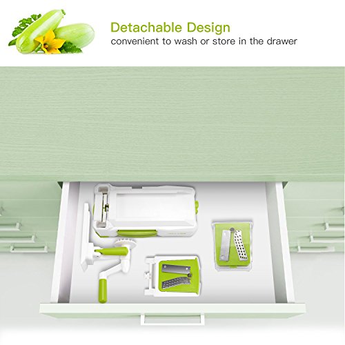 SUPERIOR DESIGN: The unit keeps all of its attachments on board and is easy to setup, use and store, saving you valuable time and money. Our Spiralizer BREAKS DOWN INTO 4 EASY SECTIONS to slip effortlessly into your kitchen drawer. The safe and stronger design makes it easy to make “Magic Spaghetti". Your kids will be far more willing to eat the veggies! Designed to hand wash easily. Just rinse with running water and drip-dry. Dishwasher safe!