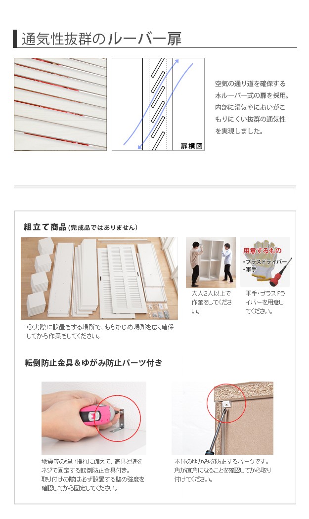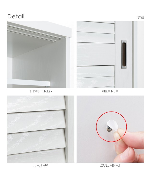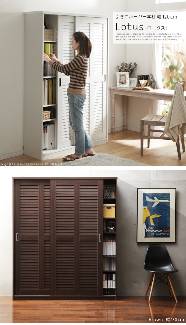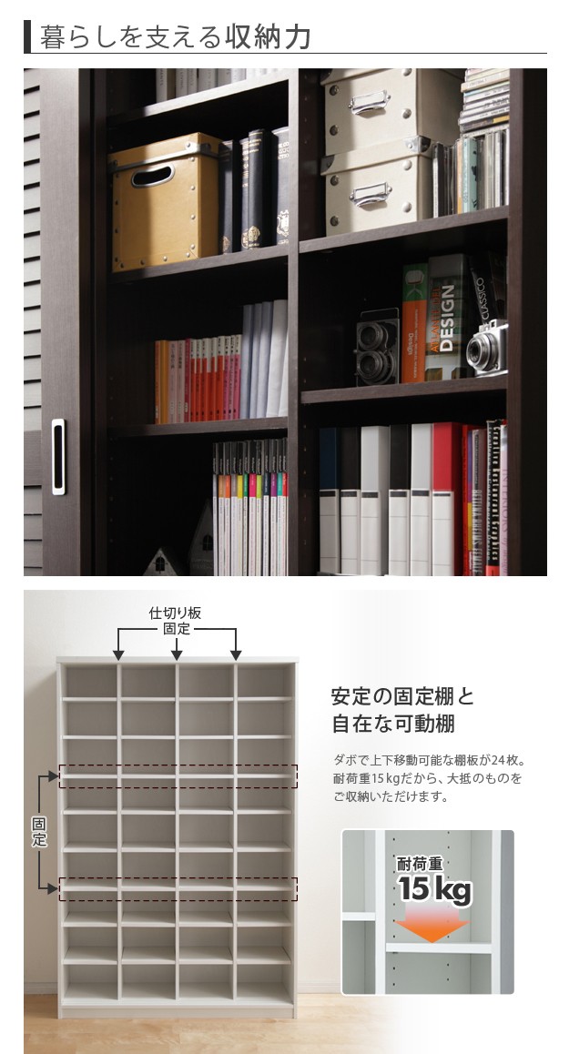 商品について:引き戸ルーバー扉のブックシェルフ。引き戸タイプなので扉の開閉スペースがとれない場所にも設置OK。通気性の良いルーバー扉で大切な本を湿気から守ります。可動棚は耐荷重(1枚あたり)約15kg、3.2cmピッチで高さ調節ができます。固定棚x4箇所、可動棚x24枚。
