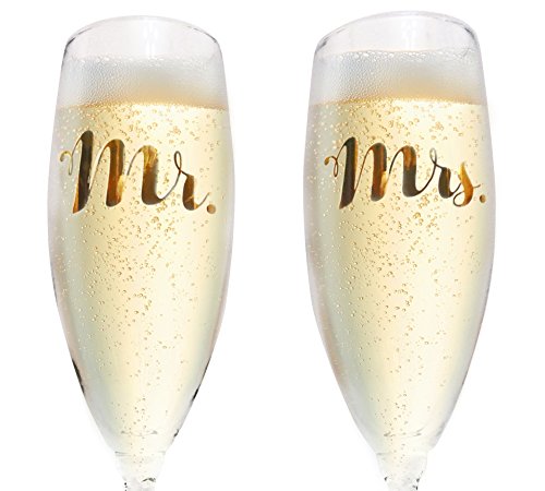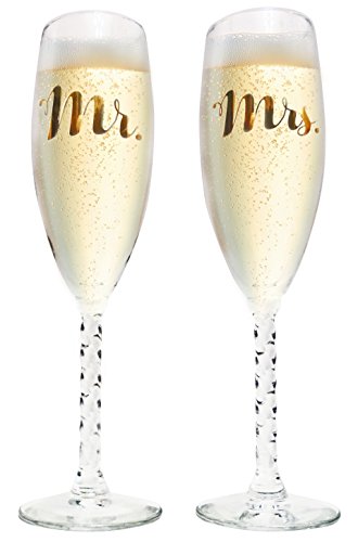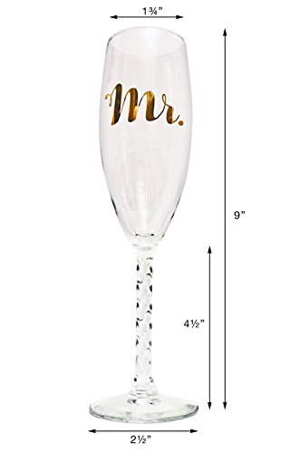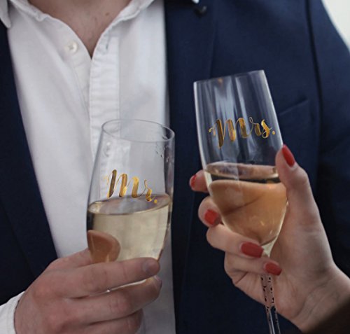 The NDear Mr. and Mrs. Glass Champagne Flutes with Golden Font is a set of two champagne flutes, one of which saying Mr. and the other champagne flute saying Mrs. Both of them feature elegant gold lettering that is thickly scrawled in easy to read cursive and it is in a sophisticated gold color that will add luxury to your wedding. These wedding champagne flutes are made entirely of glass and feature a beautifully detailed, twist style stem that is as long and as elegant as the slender cups on top of them. Because they are made of glass, they make for beautiful keepsakes that you can pack up and bring home with you after the wedding has ended to remember the night by. The NDear Mr. and Mrs. Glass Champagne Flutes with Golden Font can be purchases as a gift for the new bride and groom, or purchased by the bride and groom themselves in order to prepare for the big night and have their table set with them before they arrive at the reception. These Mr. and Mrs. champagne flutes photograph well and will stand out in the crowd of others. Purchase the matching cake topper for a streamlined look and enjoy $5 off of your total purchase! Order the NDear Mr. and Mrs. Glass Champagne Flutes with Golden Font today and get ready for your wedding by clicking add to cart now. 0 |