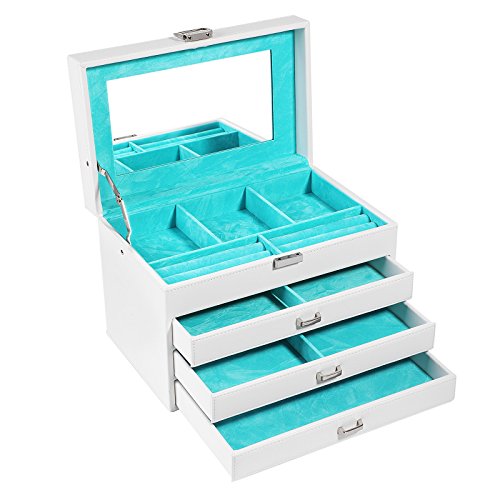 SONGMICS Jewelry Box Organizer Leather Jewelry Storage Case with Large Mirror and 3 Drawers White UJBC113