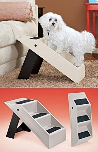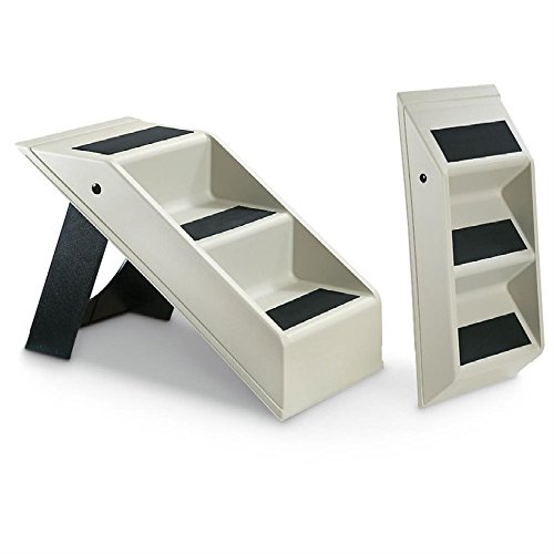 Three-step, durable plastic unit is 14-1/2" high when locked in place, and folds flat to 26" x 12" x 41-/2" for easy transport or storage. Each step is 11-1/2" wide with non-slip, rubberized treads. Supports up to 50 pounds so it should easily accommodate most pets. For indoor/outdoor use.