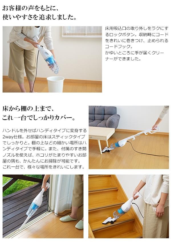 | お客様の声をもとに使いやすさを追求した掃除機です。ハンドルを外してハンディでも使える2way仕様で、お部屋のさまざまな場所に使えます。自立タイプなのでお部屋のスペースをとりません。 |