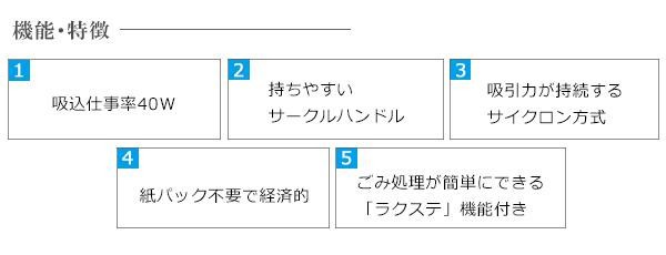 | 仕様 | 電源:AC100V 50/60Hz 消費電力:240W 電源コード長:約5.0m 運転音:78dB以下 スイッチ:スライド式 集塵方式:サイクロン式 集塵容量:約0.5L 吸込仕事率:40W 床用吸込口:ノーマル ダストケース:水洗い可 |