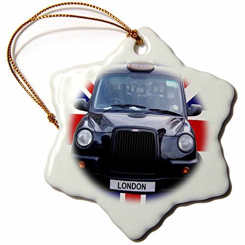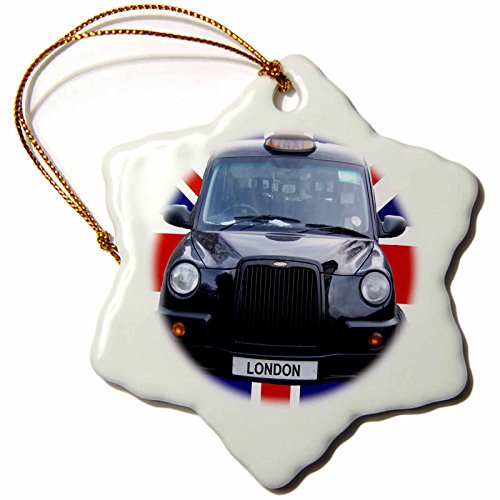 3dRose orn_113050_1 London Black Taxi Cab on British Flag Union Jack Background-UK Great Britain Travel-Snowflake Ornament, Porcelain, 3-Inch