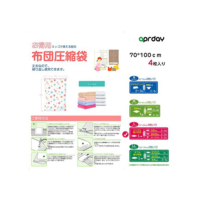 원본상품명: Aprday ?縮袋 衣類 布??縮袋 ?納袋 自動ロック式バルブ 繰り返し利用可能 ?縮率75% 手動 ポンプ付き 70x100cm 4枚