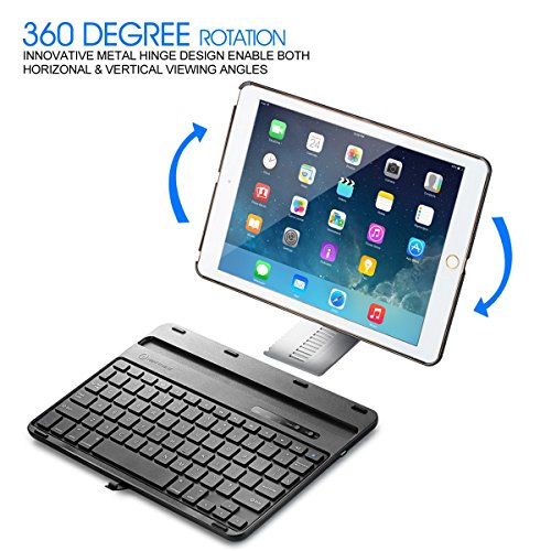 *** Upgrade Complete *** | Introducing the Airbender 3.0, the upgraded all-in-one wireless Bluetooth keyboard case designed specifically for your iPad Air/Air 2. Stylish design, metal hinge, well-rounded protection with a reliable Bluetooth connection all compacted into a lightweight design weighing just 2 lbs with the iPad installed. Enjoy your iPad Air a little more, even when you are out and about! | *** 360 Degree Revolution ***| Adjust your viewing angles and orientation to your heart's desire with the Airbender 3.0's unique ambidextrous all metal arm/hinge. View your iPad Air in landscape or portrait mode by simply rotating the iPad Air, or detach it for an 'iMac' experience with your iPad Air. | *** Spacious Typing *** | Taking what we know about keyboard design and adding more spacious, chiclet keys for a satisfying and tactile typing experience. Let's not forget the simplicity of the pairing process via Bluetooth for consistent connectivity of up to 30 feet away. With productivity maximized, touch typists rejoice! | *** Keyboard Specifications ***| Input: 5V@1A | Bluetooth connection: Range of 30ft or 10m | Dimensions: 9.4 x 7.1 x 0.8 inches | Be sure to find the official New Trent logo to ensure a 10 month warranty.Feature