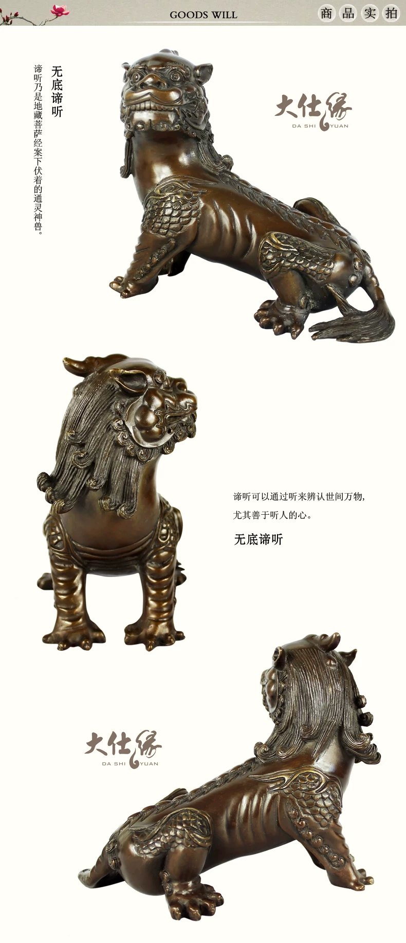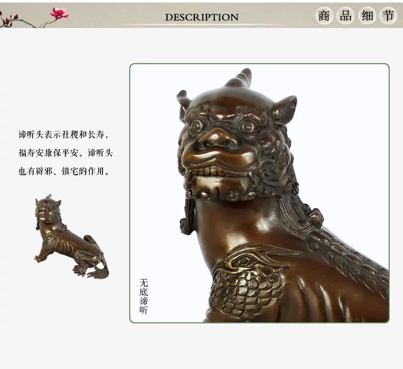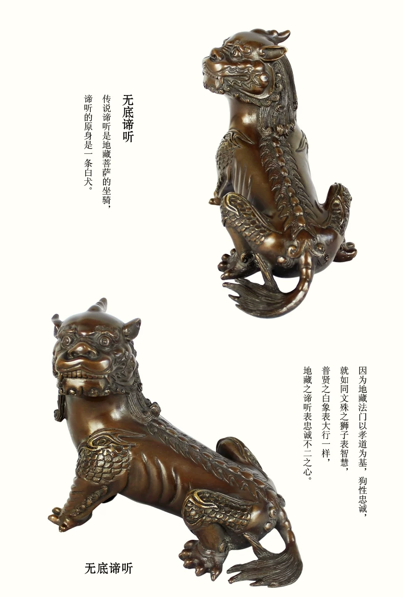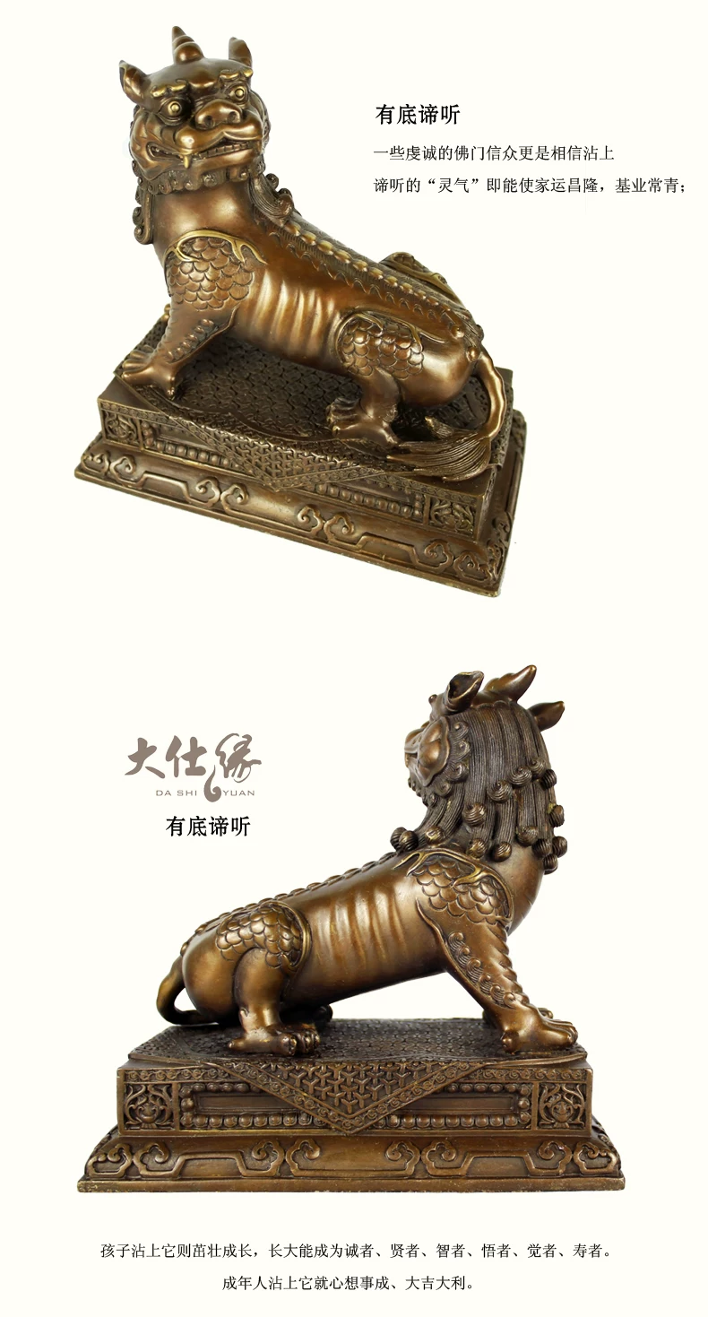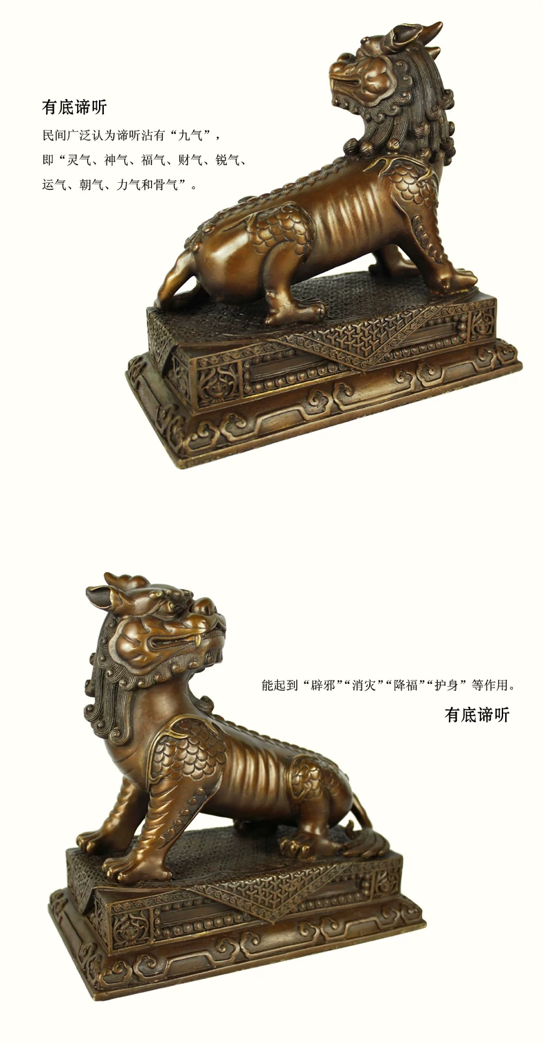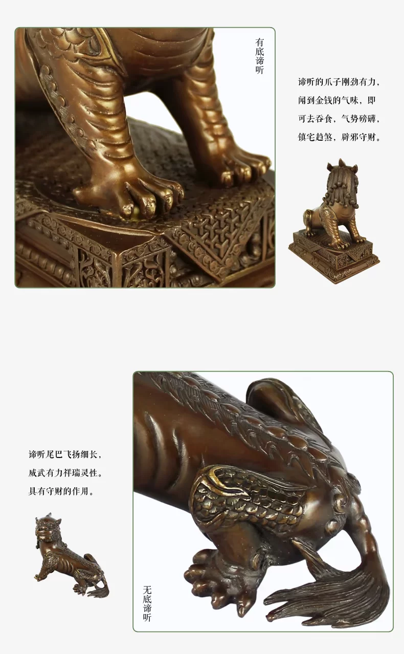 谛听,沾有“九气”,即“灵气、神气、福气、财气、锐气、运气、朝气、力气和骨气”。能起到“辟邪”、“消灾”、“降福”、“护身”等作用。沾上谛听的“灵气”即能使家运昌隆,基业常青;孩子则茁壮成长,长大能成为诚者、贤者、智者、悟者、觉者、寿者。成年人带着它就心想事成、大吉大利