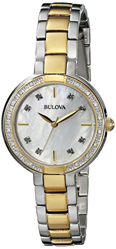 -. Binding : Watch -. Brand : Bulova -. Color : Two-Tone -. Department : womens -. EAN : 0042429501539 -. Feature : Bulova's dazzling timepiece, adorned with a diamond-encrusted bezel and an opulent mother-of-pearl dial, is as fancy as it is functional with a numberless display and classic two-tone bracelet. / Quartz movement with analog display / Protective mineral crystal dial window / Features include 29mm case diameter, 26 diamonds individually hand-set on case and white mother-of-pearl dial / Water resistant to 99 feet (30 M): withstands rain and splashes of water, but not showering or submersion -. Label : Bulova -. Manufacturer : Bulova -. Model : 98R172 -. MPN : 98R172 -. NumberOfItems : 1 -. PackageQuantity : 1 -. PartNumber : 98R172 -. ProductGroup : Watch -. ProductTypeName : WATCH -. Publisher : Bulova -. ReleaseDate : 2013-07-08 -. Size : Standard -. Studio : Bulova -. Title : Bulova Women's 98R172 Diamond-Accented Watch -. UPC : 042429501539