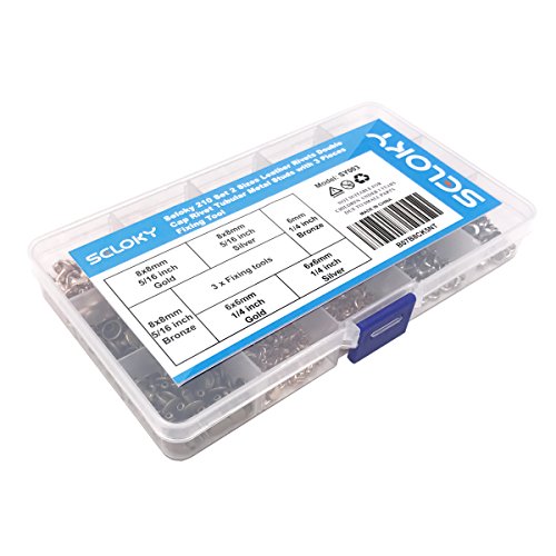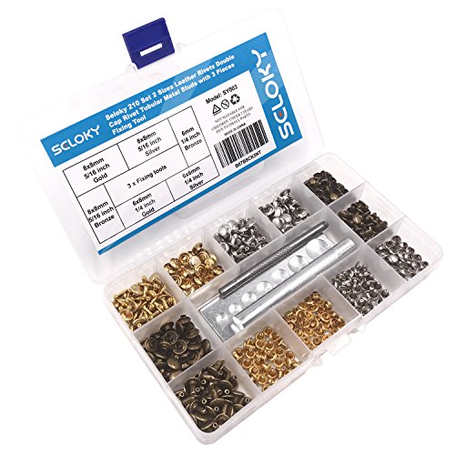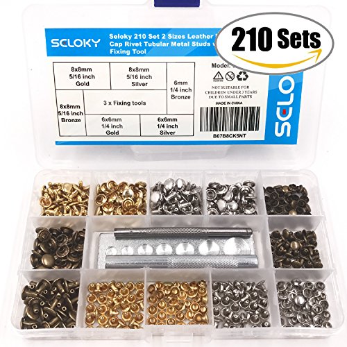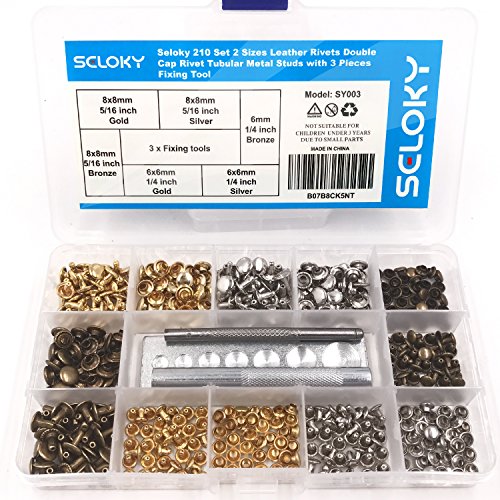 Seloky 210 Set 2 Sizes Leather Rivets Double Cap Rivet Tubular Metal Studs with 3 Fixing Tool Kit for Leather Craft Repairing Decoration,2 Sizes and 3 Colors (Gold, Silver and Bronze)
