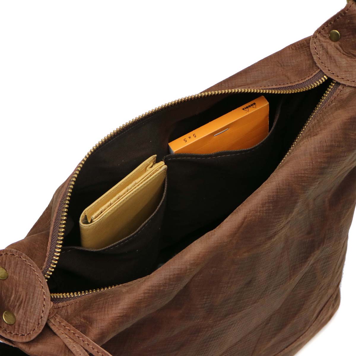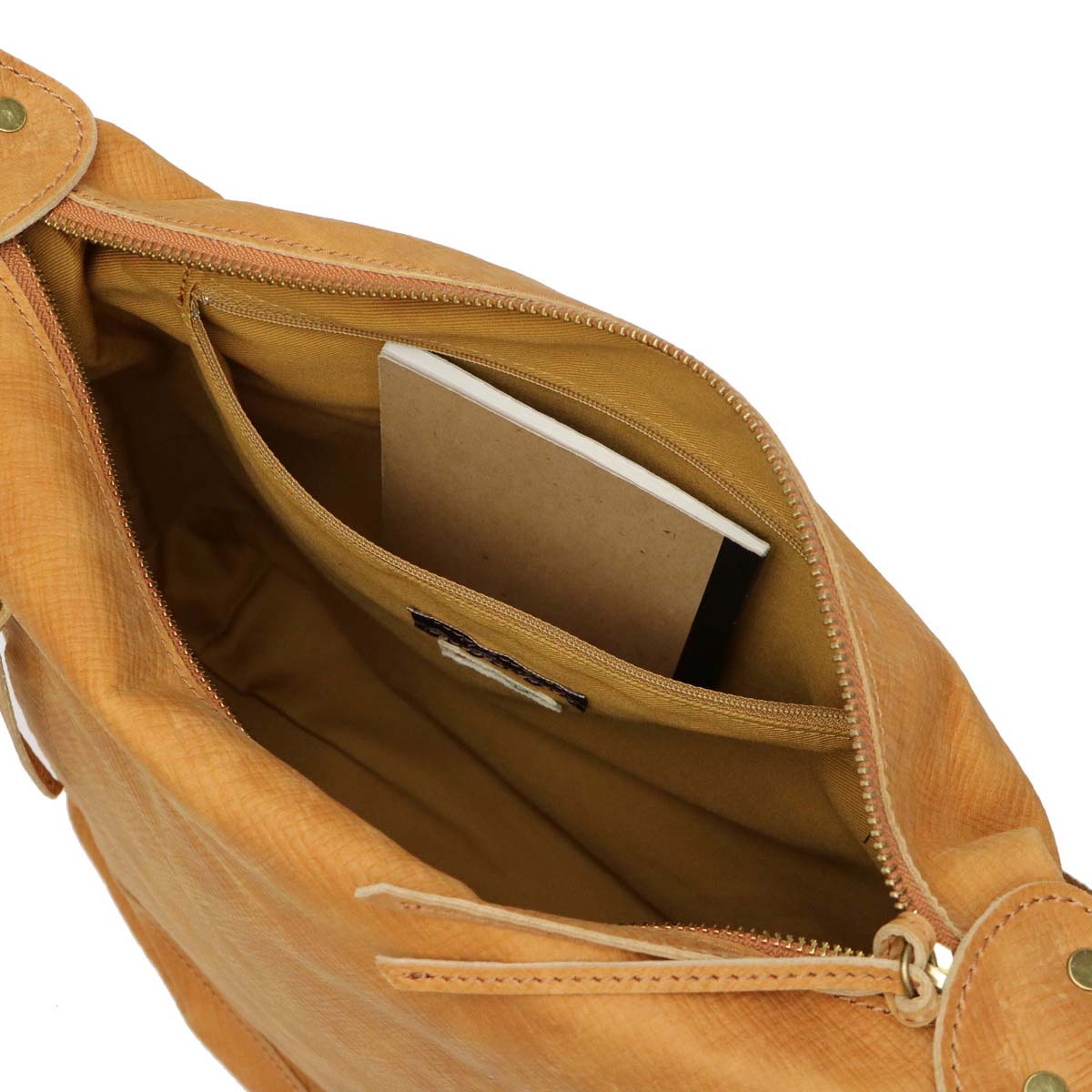 Main room with depth that B5 size fits perfectly vertically. Because it has a wider gore, you can store your luggage more than you can see. Pocket is also fulfilling inside, you can organize small items without mixing luggage inside. It is also a point that leather of storage hole zip pull is becoming accents of design.