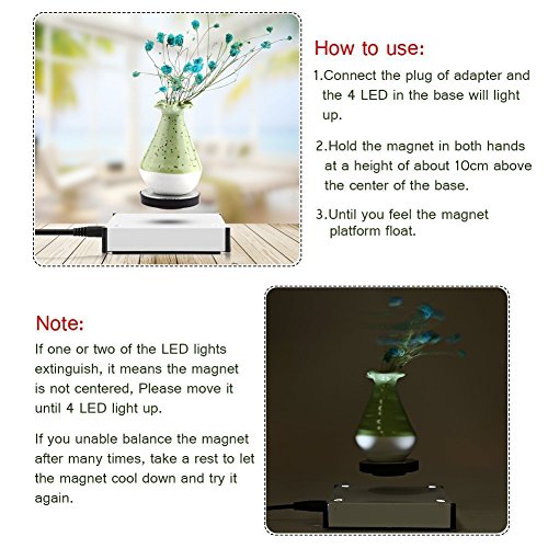 Studio : Yosoo Publisher : Yosoo Binding : Toy Product Description This item is an attention grabber in all parties as it can levitate models, jewelry, memorabilia and other collectibles. How to use 1.Connect the plug of adapterr and the 4 LED in the base will light up. 2.Hold the magnet in both hands at a height of about 10cm above the center of the base. 3.Until you feel the magnet platform float. Note: If one or two of th LED lights extinguish,it means the magnet is not centered,please move it until 4 LED light up. If you unable balance the magnet after many times,take a rest to let the magnet cool down and try it again. 0