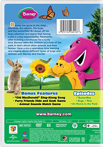Barney has gone to the dogs… the birds, the rabbits, the bugs, and the butterflies! BJ shows off his bug collection and learns that having a pet is a big responsibility. Meanwhile, after building a birdhouse for a lucky bird, Barney takes the children on a tour of the park to learn about other animals and their homes. Have a stu-u-upendous time learning and singing about different types of bugs and animals with Barney and friends!