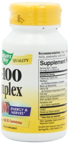 -. Binding : Health and Beauty -. Brand : Nature's Way -. Feature : 2 Bottles of 100 Capsules / for Energy & Nerves B vitamins are essential to the conversion of cellular energy, manufacture of hormones and proteins, and repair and maintenance of nerve structures / Nature's Way -. Label : NATURE'S WAY -. Manufacturer : NATURE'S WAY -. MPN : 89947 -. PackageQuantity : 1 -. PartNumber : 89947 -. ProductGroup : Health and Beauty -. ProductTypeName : HEALTH_PERSONAL_CARE -. Publisher : NATURE'S WAY -. Studio : NATURE'S WAY -. Title : Nature's Way B-100 Complex