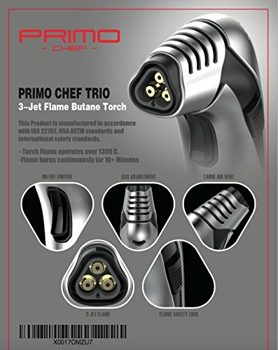 - TRIPLE JET FLAME PROFESSIONAL CULINARY TORCH - The only triple flame torch on Amazon. Cover more surface area and speed up your torch projects. Perfect for Creme Brulee, caramelize sugars, sear steak or other meats, glaze ham, roast vegetables, melt cheese or chocolate, toast or crisp any recipe.